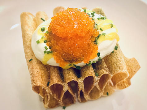 Frasig Gaufrette med friterad potatis, löjrom, syrad grädde och gravad citron.